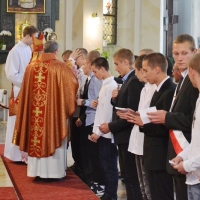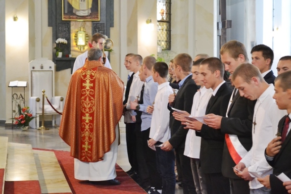Trzynastu uczniów z klas II i III gimnazjum w czasie mszy św. sprawowanej przez księdza biskupa Mariusza Leszczyńskiego otrzymało z jego rąk sakrament Ducha Świętego. W tym dniu jak co roku obchodzimy rocznicę nadania Zespołowi Placówek imienia św. Jana Pawła II. Świętowanie rozpoczynamy mszą św. w kościele parafialnym pw. św. Stanisława B.i M. Wspólnie z rodzicami, przybyłymi gośćmi, Dyrekcją, nauczycielami, pracownikami uczestniczymy we mszy św. dziękując, prosząc Pana Jezusa przez wstawiennictwo naszego Patrona o potrzebne dla nas łaski.