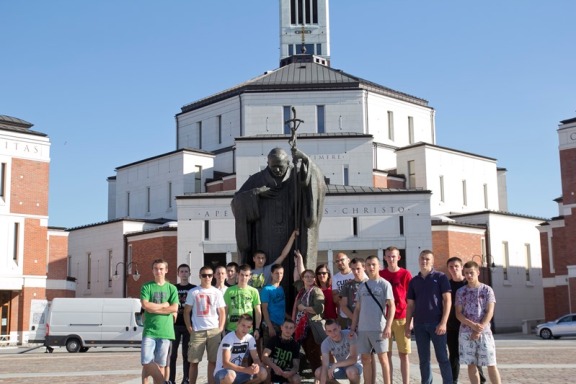 Kraków – miasto młodości Karola Wojtyły: tu podjął naukę na Uniwersytecie Jagiellońskim, tu też wstąpił na drogę kapłańskiego powołania, która doprowadziła Go, jako następcę św. Piotra, do Rzymu. Wędrówkę po Krakowie rozpoczęliśmy od katedry na Wawelu, gdzie Karol Wojtyła przyjął święcenia kapłańskie, a po latach otrzymał sakrę biskupią. Zwiedziliśmy również komnaty królewskie oraz oddaliśmy cześć ś.p. Prezydentowi Lechowi Kaczyńskiemu i jego małżonce. Pod dobrym obiedzie i spacerze nad Wisłę przemieściliśmy się do Łagiewnik – Sanktuarium Bożego Miłosierdzia, które papież Jan Paweł II nawiedził po raz ostatni w 2002 roku. Mieliśmy też chwilę na modlitwę i refleksję przed obrazem Pana Jezusa Miłosiernego i relikwiami św. Siostry Faustyny Kowalskiej. Po drugiej stronie sanktuarium, na wzgórzu, znajduje się Centrum św. Jana Pawła II wybudowane z inicjatywy kard. S. Dziwisza jako wotum wdzięczności za posługę naszego wielkiego Papieża. Duże wrażenie zrobiła na nas sutanna św. Jana Pawła II, w której został ranny podczas zamachu na Jego życie w dniu 13 maja 1981 roku – dziś to relikwia I stopnia.